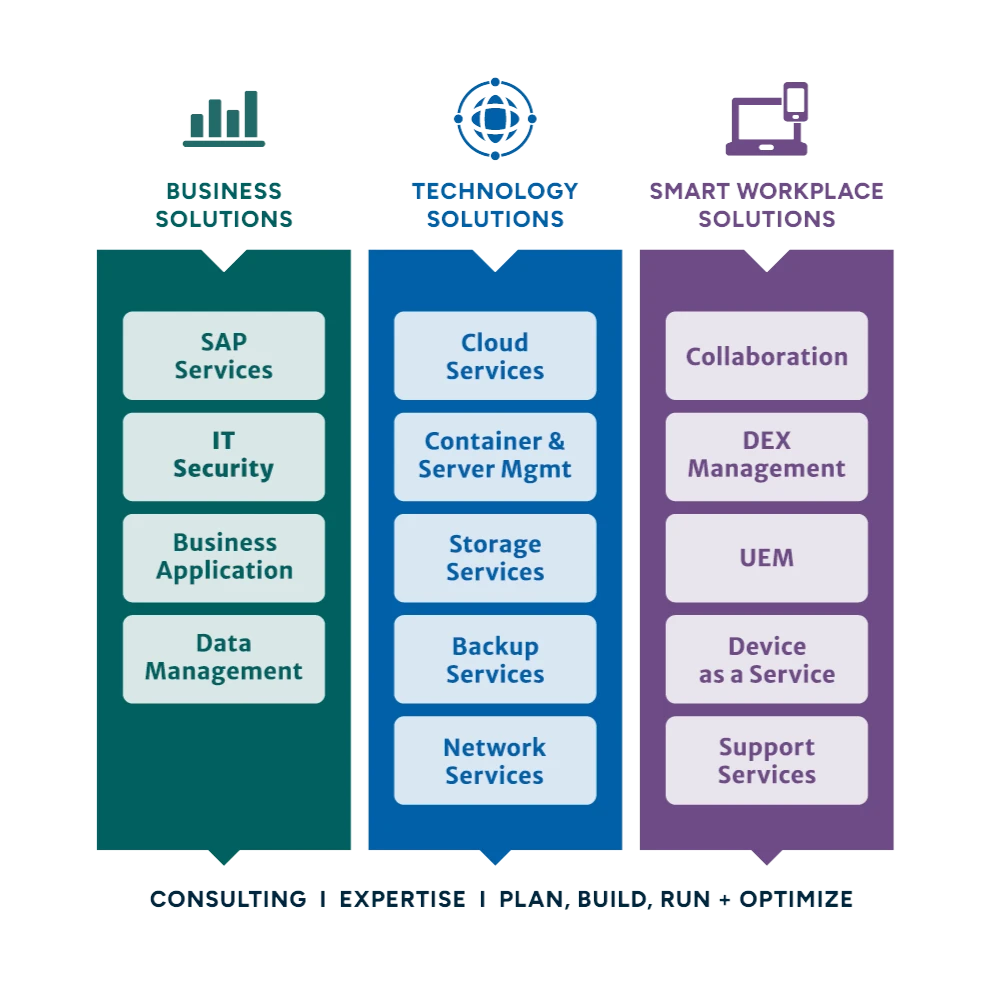 Im Consulting analysieren wir Ihre IT-Landschaft, entwickeln Betreiber-Konzepte und beraten strategisch für Ihren Geschäftserfolg. Mit unserer Expertise unterstützen wir Sie in Ihren IT-Projekten. Durch unsere Build and Manage Services übernehmen wir die Planung und den Betrieb Ihrer IT-Aufgaben, um Ihre Effizienz und Produktivität zu steigern.