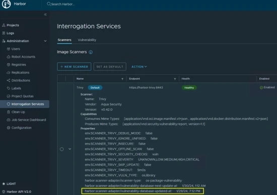 Nachdem VMware Supervisor Services umgesetzt hat, ist der Trivy Vulnerability Scanner in der Harbor Supervisor Service Installation enthalten. Um Trivy nutzen zu können, muss die Trivy-DB mindestens einmal aktualisiert werden beziehungsweise muss sie heruntergeladen werden, da sie nicht im Standard-Paket enthalten ist.