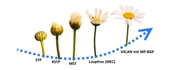 STP -> RSTP -> MST -> LOOPFREE (MEC) -> VXLAN MIT MP-BGP