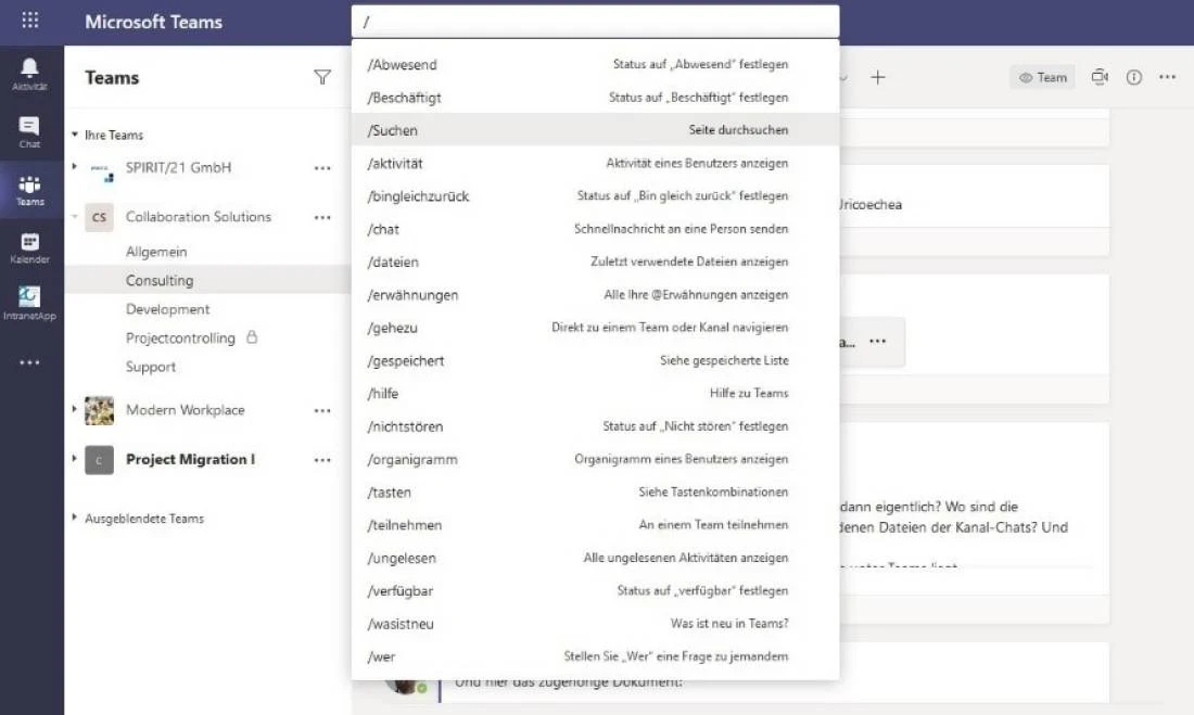 Ein alternativer Zugang zu einer bekannten Funktion ist beispielsweise die Änderung des eigenen Status: Mit “/Abwesend” ändert man direkt seinen persönlichen Verfügbarkeits-Status, der üblicherweise über einen Mausklick auf das eigene Profilbild geändert wird. “/Organigramm” hingegen ermöglicht die Darstellung einer gewählten Person in einem Organisations-Diagramm. Mit dem “/” können zusätzlich auch Bots angesprochen werden, insofern sie installiert und freigeschaltet sind. Ein gutes Beispiel ist dabei der „Who-Bot“ von Microsoft, der mit “/Who” beziehungsweise mit “/Wer” aktiviert wird.