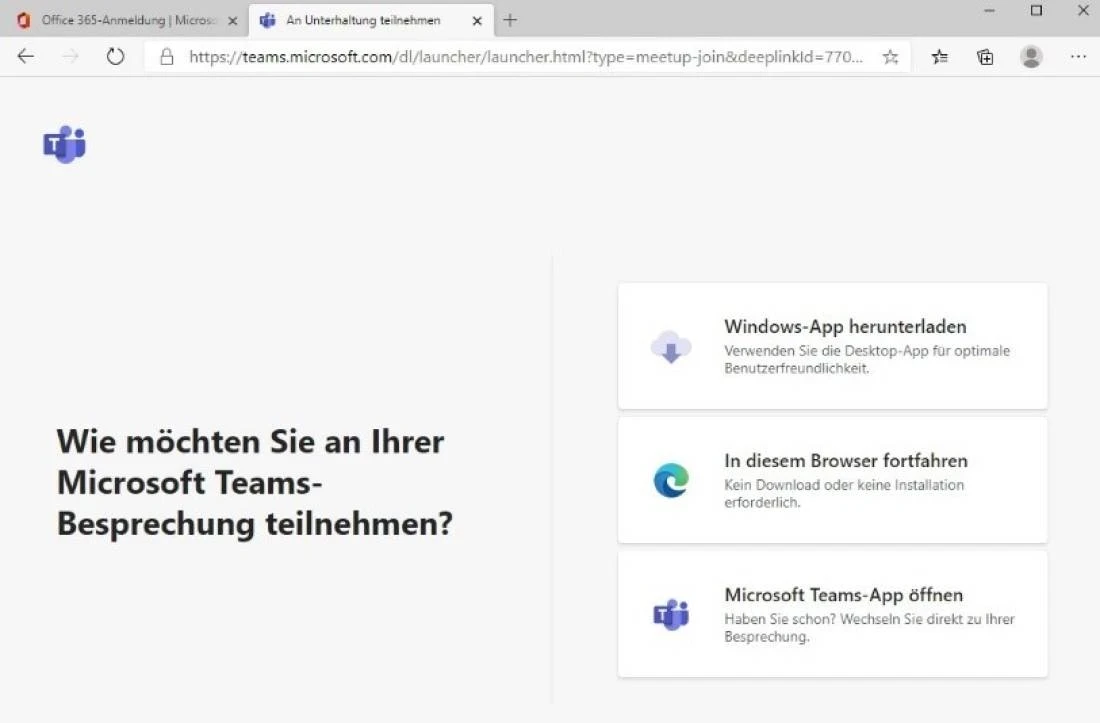 Falls ein‘e Teilnehmer‘in mit dem Weblink einer Termin-Einladung auf eine Teams-Besprechung zugreift, werden in einem Browserfenster mehrere übersichtlich dargestellte Optionen zum Start dieser Besprechung angeboten. Dabei wird zwischen der Neuinstallation von Microsoft Teams, der Verwendung des bereits installierten Teams oder der Teilnahme per Browser unterschieden.