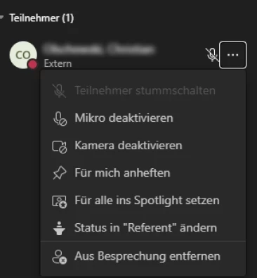 Das gleiche gilt für die Aktivierung bzw. Deaktivierung von Mikrofon und Kamera je Teilnehmer. Dazu ist einfach das Kontextmenu der jeweiligen Person aufzurufen.