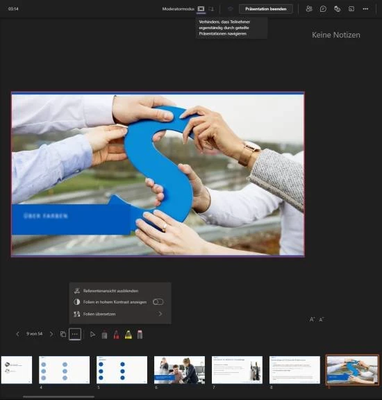 - Durch die Schaltfläche “Verhindern, dass Teilnehmer …” rechts vom Moderatorenmodus kann unterbunden werden, dass sich die Teilnehmer während der Präsentation eigenständig durch die Folien navigieren.