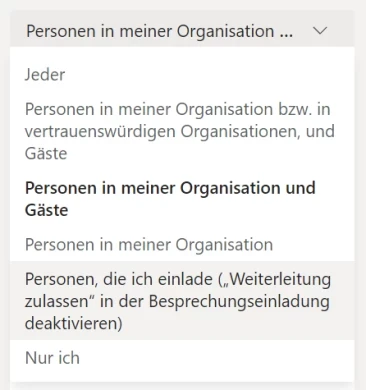 Beispielsweise bei “Wer kann meinen Wartebereich umgehen” die Möglichkeit “Personen, die ich einlade” anzugeben. Kombiniert mit der Deaktivierung von “Weiterleitung zulassen” in der Outlook-Einladung kann hier der Personenkreis, der den Wartebereich umgehen kann, genau definiert werden.