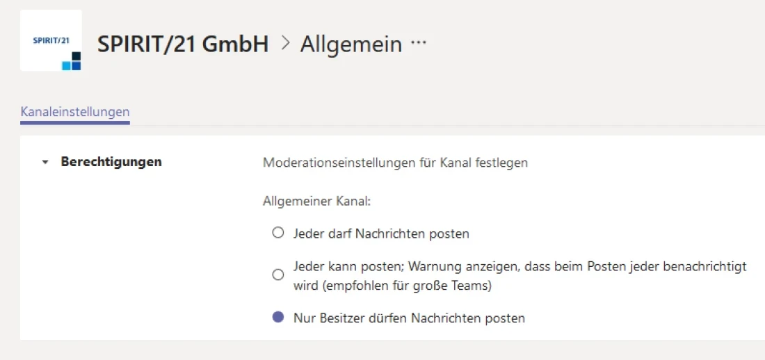 Kanäle können durch Registerkarten und Konnektoren erweitert werden. Konnektoren veröffentlichen beispielsweise in SharePoint erstellte Neuigkeitsbeiträge parallel in einem Kanal und verlinken diese. Ähnlich wie in den Mitgliederberechtigungen eines Teams können auch in einem Kanal Berechtigungen gesetzt werden. Primär wird dabei in den sogenannten Kanaleinstellungen definiert, ob „Jeder“ oder nur die Besitzer Nachrichten im jeweiligen Kanal posten dürfen.