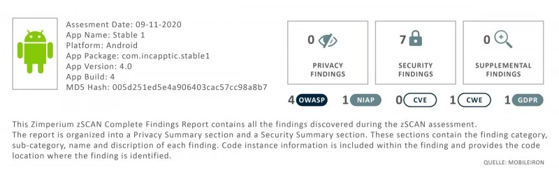 Die Integration von automatisierten Risiko- und Bedrohungsanalysen kann die Einhaltung von Richtlinien und Verordnungen deutlich erleichtern und Risiken lassen sich bereits vor dem Rollout erkennen und bewerten. Schnittstellen in incapptic Connect ermöglichen die Integration von z.B. zScan von Zimperium direkt in die Build Pipeline. So lassen sich schon beim Upload der App (z.B. durch den Entwickler) entsprechende Analysen durchführen, bevor die Daten überhaupt in den weiteren Prozessablauf gehen. Dabei wird der Code der App selbst geprüft, das Verhalten der App und welchen Kontext die App verwendet, wie z.B. Zertifikate, Netzwerke, Domains.